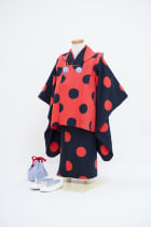 黒と赤のドット柄。ポイントにストライプ柄が入っているところもかわいいです。個性的でモダンな着物はママから絶大なる人気があります。