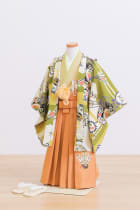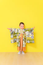 太鼓と矢羽が描かれており、ばあばやじいじウケの良い古典柄の着物です。力強いデザインですが全体的に明るい色なので3歳も可愛く着こなせます。兄弟で色違いもあるのでお揃いで着ても素敵な着物です。