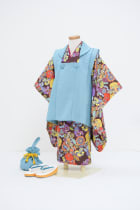 モダンフラワーの茶色の着物にパッキリとした水色の被布でレトロモダンな雰囲気のお着物。おしゃれで個性的なHAPISTAならではの一着です。