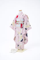 迫力のある鶴が特徴的なお着物です。古典的に見える一着ですが、ベビーピンク地がベースになっていることで可愛らしく柔らかい印象になっています。姉妹や姉弟でお揃いで着て頂けるのでおすすめです。