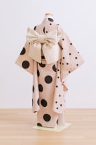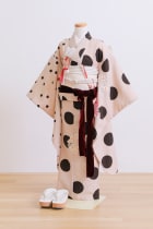 ベージュの優しいお色味のドットのお着物、お花の刺繍もポイントで7歳に大人気な1着です。ベロアのしごきが大人可愛い印象を与えます。色違いで兄弟、姉妹でもご用意しております。