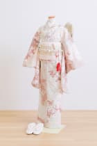 着物には沢山のお花が描かれており、優しい雰囲気で女の子らしさを引き出してくれる一着です。帯には縦にラインが入っており、スッキリと見せてくれます。優しいお色味が好きなお子様に大人気の1着です。