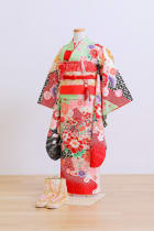うす緑色ベースに黒色と赤色で引き締まったお着物。帯はゴールド系で馴染ませ、帯揚げとしごきを赤色にすることで可愛いかっこいいを両方表現できる一着です。
