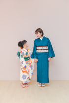 大人な雰囲気の深緑色のお着物です。帯には菊の花が描かれていて、上品な仕上がりになっております。帯締めと帯揚げの色が差し色になっておりお洒落です。落ち着いた雰囲気がお好みのママさんにオススメです。