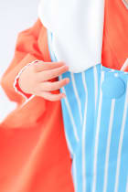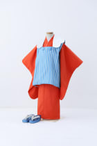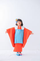 鮮やかな朱赤と水色ストライプのHAPISTAオリジナル着物。 雲の形の襟が一推しポイント! 無地だけれど色の組み合わせがとってもかわいいので 兄弟や姉妹でも、お揃いができちゃいます。