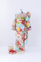 LOWRYS FARMさんのお着物です。 大人気の水色が引き立て合い大変華やかな印象を与えます。髪型や髪飾り次第でレトロにもモダンにも仕上がるので、他の人と被りたくない方に人気です。