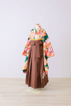 緑のお着物に色鮮やかな大きいお花柄。帯は黄色で華やかに、茶色の袴で少し大人っぽくお姉さんな印象になる1着です。