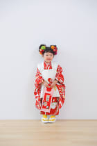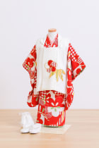 赤色の着物に白色の被布。被布が白なのでお顔写りが明るくなります。お参りで神社に行く時に一番の人気です!