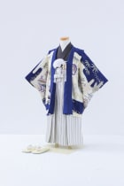 鮮やかな青色の羽織に背面には大きなお城に鷹が描かれていて、とても男の子らしい着物です。着物は黒でしまった感じですが、袴のシルバーで明るさも取り入れた古典柄の一着です。