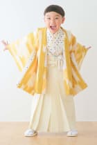 着物が白色ベースに黄色・薄水色・黒色の水玉が散りばめられているところが可愛いポイントです!袴は無地のクリーム色に、羽織はPOPな黄色の矢羽根になっており、全体的にパッと明るく、男の子らしい元気な印象を与えてくれるお着物になっています。